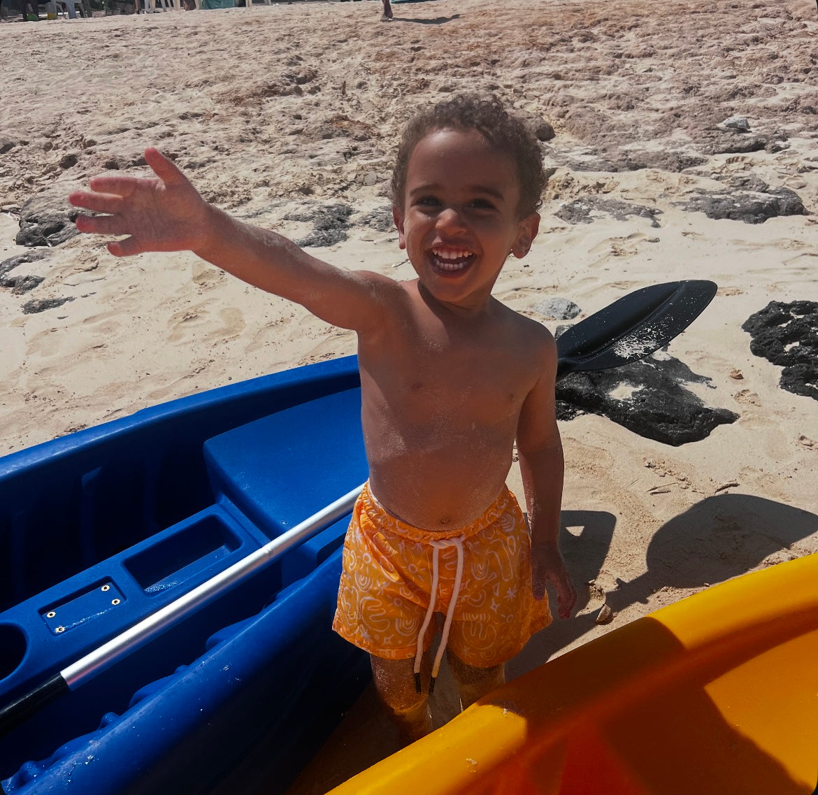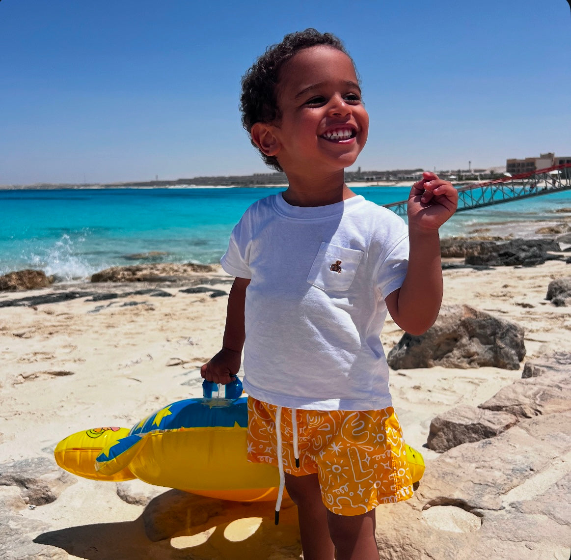This yellow abstract swimsuit brings sunshine to every splash. It's designed to stand out while keeping your little one cool and comfy.